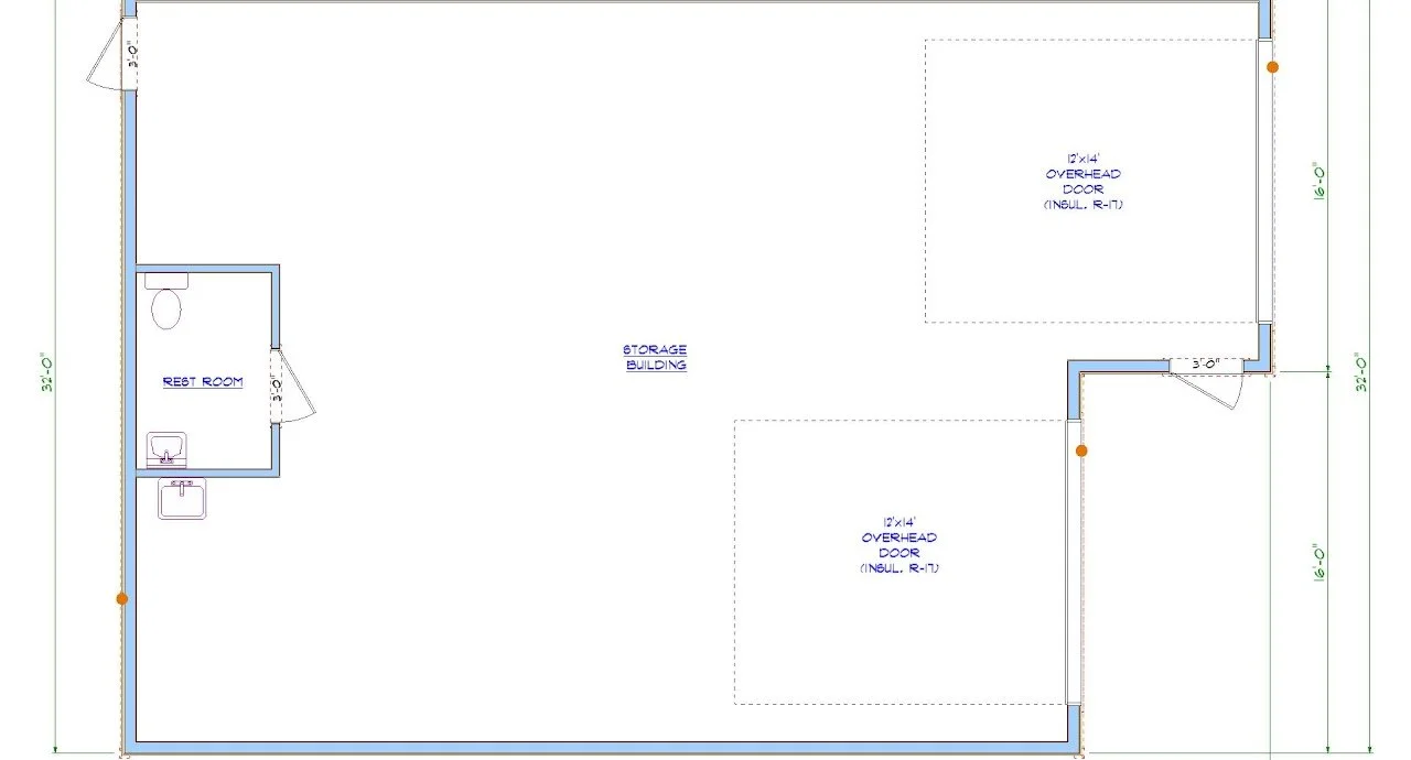 32’ x 64’ x 16’ = 2,112 sq.ft.